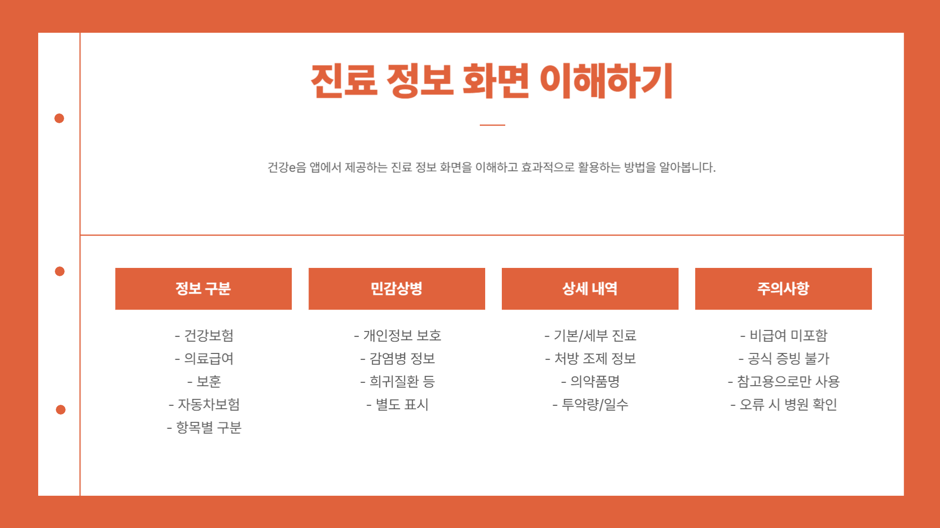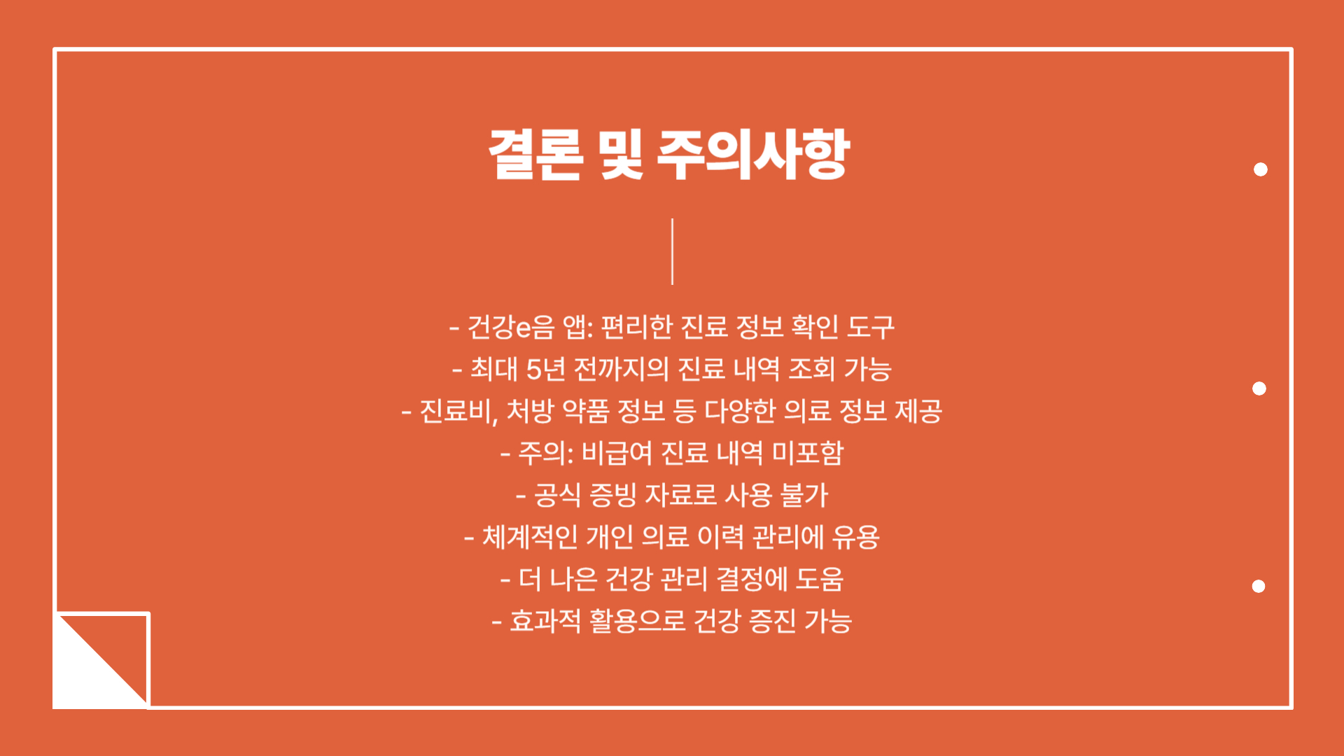 또한, 건강보험 혜택이 적용되더라도 일부 진료 내역이 누락될 수 있습니다. 건강e음 앱의 진료 정보는 단순 참고용으로만 사용해야 하며, 직장이나 보험사에 제출할 공식 증빙 자료로는 사용할 수 없다는 점을 기억해야 합니다.
